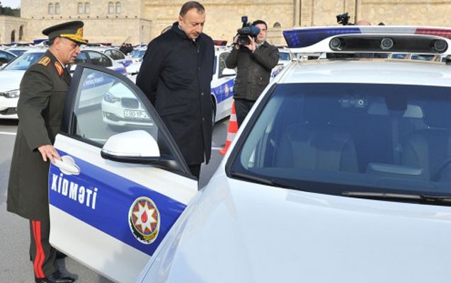 İlham Əliyev yeni polis maşınlarına baxış keçirdi-