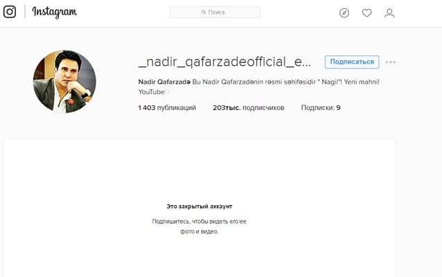 Müğənni Nadir Qafarzadə rəsmi instaqram hesabını bağlayıb.