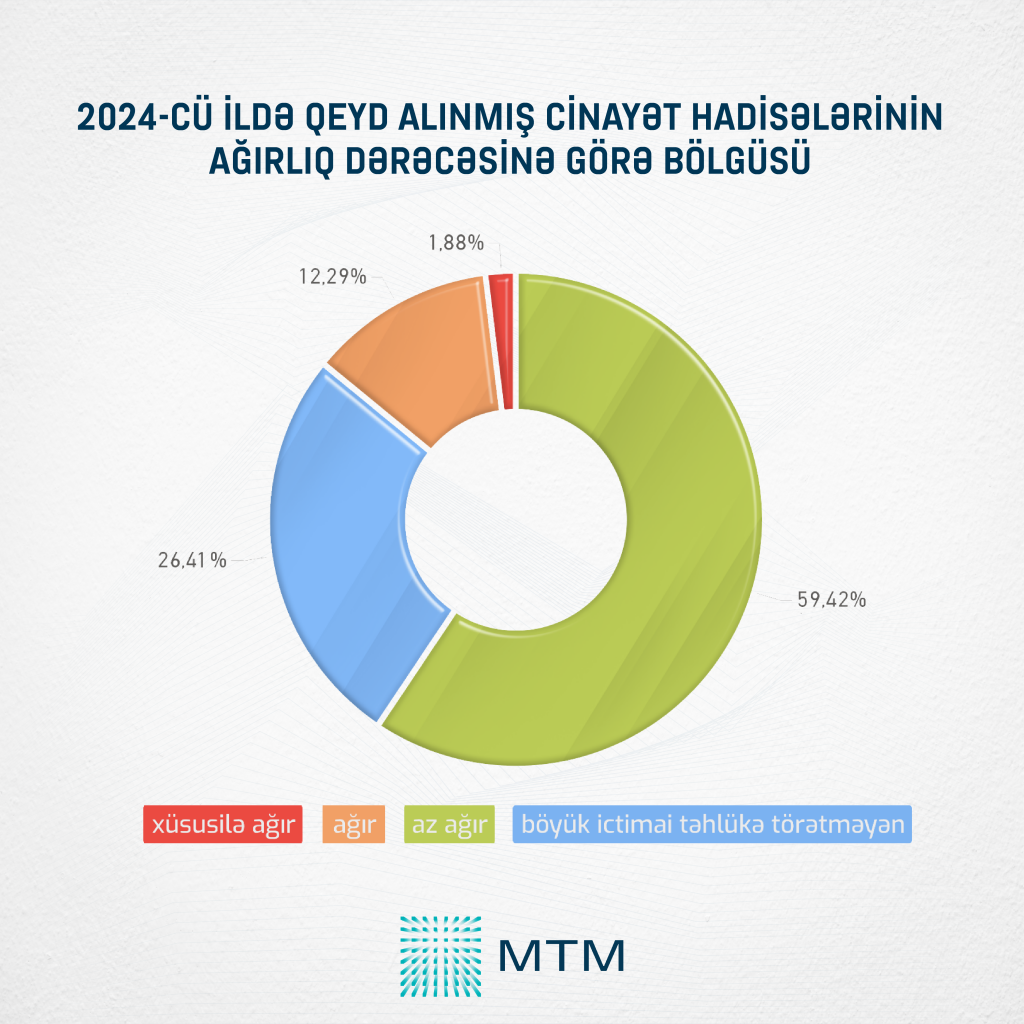 Rəsmi rəqəmlər göstərir ki, 2024-cü ildə qeydə alınan 33 379 cinayət hadisəsinin 59,42%-ni “az ağır” dərəcəli cinayətlər təşkil edib. Cinayətlərin struktur təhlilindən aydın olur ki, “böyük ictimai təhlükə törətməyən” cinayətlər ən yüngül hal sayılır və ötən il belə hadisələr ümumi cinayətlərin 26,41%-ni təşkil edib. 2024-cü ildə baş verən cinayətlərin 12,29%-i “ağır” dərəcəli cinayətlər olub. Ən ağır hüquq pozuntusu sayılan və daha ciddi cəza tədbirləri nəzərdə tutulan “xüsusilə ağır” cinayətlərin payı isə ümumi statistikanın 1,88%-ni təşkil edib.
