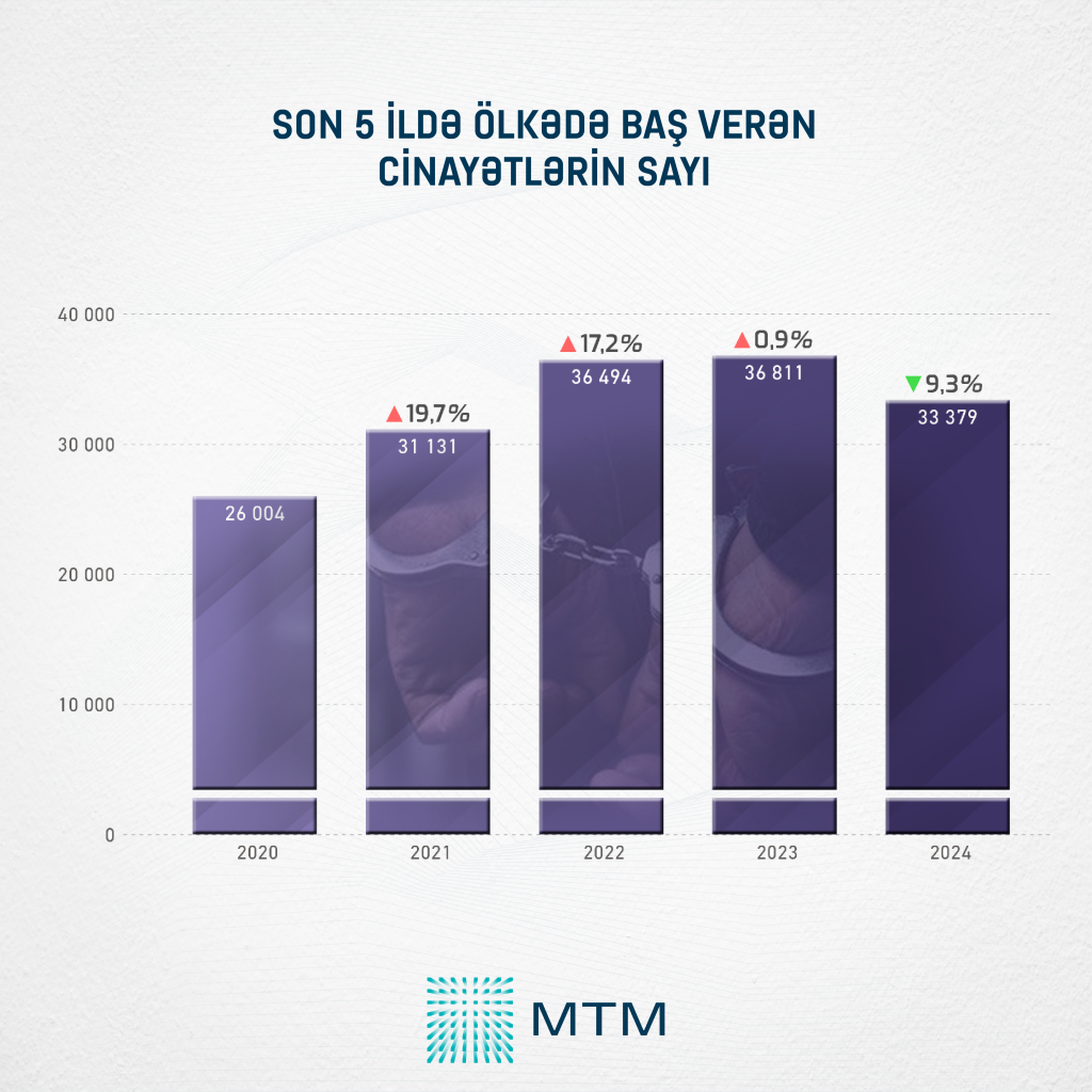 Media Təhlil Mərkəzinin (MTM) Dövlət Statistika Komitəsinin yaydığı rəsmi məlumatlar əsasında apardığı təhlilə əsasən, 2024-cü ildə ölkə üzrə qeydə alınan cinayət hadisələrinin sayı əvvəlki ilin göstəricilərinə nisbətən 9,3% və ya 3 432 hadisə azalaraq 33 379-a enib. Aparılan təhlil zamanı məlum olub ki, son beş ildə ən az cinayət hadisəsi 2020-ci ildə (26 004) qeydə alınıb. Həmin il dünyada və Azərbaycanda davam edən COVID-19 pandemiyası ilə bağlı tətbiq olunan sərt məhdudiyyətlər cinayət hadisələrinin sayının azalmasına da səbəb olub.