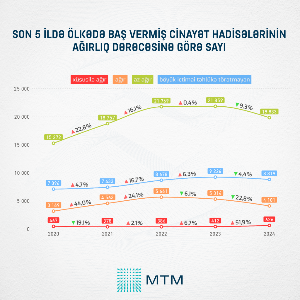 Son bir ildə sayı ən çox azalan cinayətlər “ağır” dərəcəli cinayət hadisələri olub. 2024-cü ildə “ağır” dərəcəli cinayət hadisələrinin sayı 2023-cü ilin göstəriciləri ilə müqayisədə 22,8% və ya 1 213 cinayət azalaraq 4 101-ə bərabər olub. Bundan başqa, son 1 ildə digər iki dərəcə üzrə baş vermiş cinayət hadisələrinin sayında da azalma müşahidə olunub.