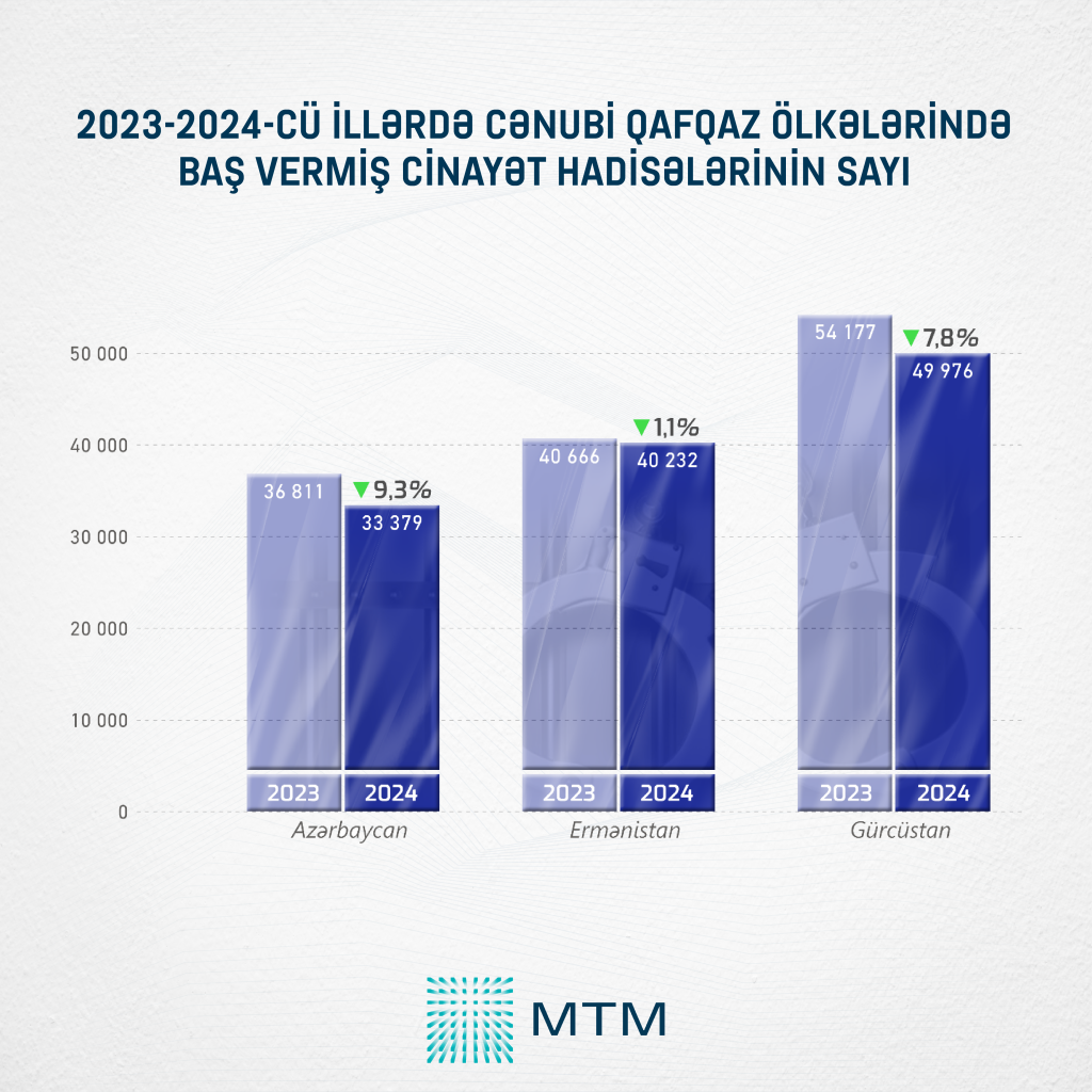 Cənubi Qafqaz ölkələrinin Dövlət Statistika Komitələrinin rəsmi internet resurslarından əldə edilən məlumatlara əsasən, 2024-cü ildə regionun hər üç ölkəsində cinayət hadisələrinin sayında azalma müşahidə olunsa da, faiz nisbəti ilə ən çox azalma Azərbaycanda qeydə alınıb. Azərbaycan həm ərazi, həm də əhali sayı baxımından regionun ən böyük ölkəsi olsa da, ölkəmizdə qeydə alınan cinayət hadisələrinin sayı digər iki ölkə (Gürcüstan və Ermənistan) ilə müqayisədə daha aşağıdır.