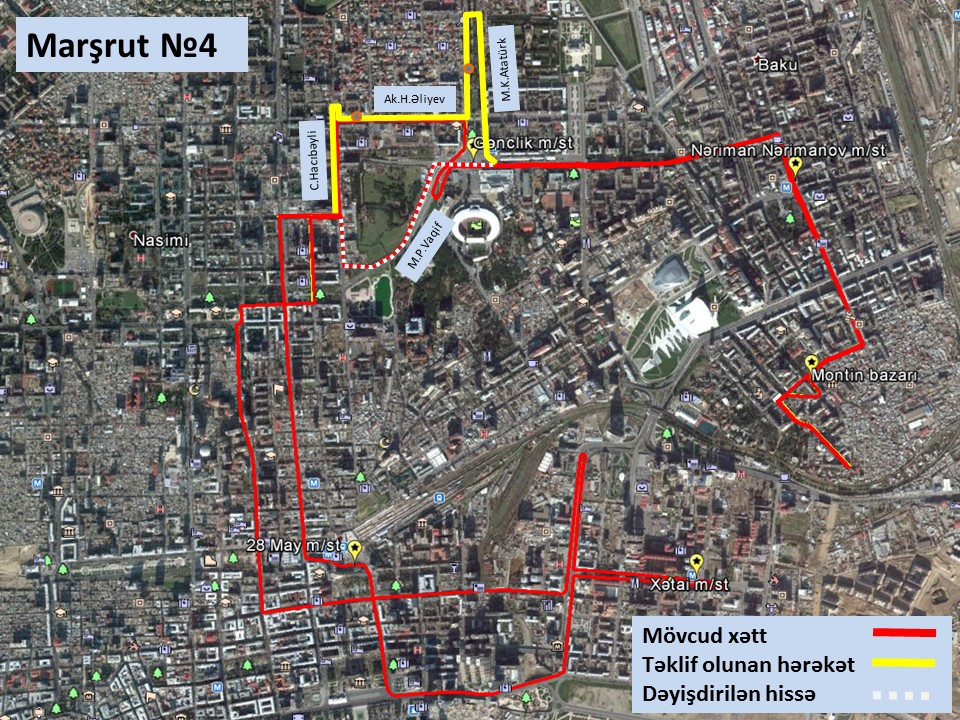 Bakı Nəqliyyat Agentliyinin mətbuat xidmətindən “Qafqazinfo”ya daxil olan xəbərdə bildirilir ki, dəyişikliyə əsasən, akademik Həsən Əliyev, Ceyhunbəy Hacıbəyli küçələri, eləcə də M.K. Atatürk prospektində yaşayan sakinlərin 4 nömrəli müntəzəm marşrut xəttindən istifadə etməklə Montin qəsəbəsi, metronun N.Nərimanov və Ş.İ.Xətai stansiyalarına rahat gediş-gəlişi təmin ediləcək. Belə ki, bu marşrut xətti üzrə avtobuslar metorunun Ş.İ.Xətai stansiyası istiqamətində hərəkət edərkən F.X.Xoyski küçəsindən M.K.Atatürk prospektinə, daha sonra akademik Həsən Əliyev və Ceyhunbəy Hacıbəyli küçələrindən keçməklə yolunu davam etdirəcək.