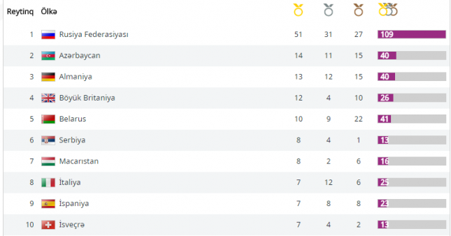 Medalların sayına görə, ölkələrin onluq siyahısını təqdim edirik: