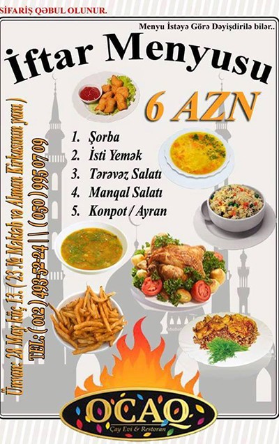 Ən uyğun qiymət və iftar menyusu isə Ocaq restoranınında təklif olunur. 6 manata şorba, isti yemək, salatlar və kampot, ayran daxildir. Müştərilər yeməklərin də dadlı olduğunu söyləyir.