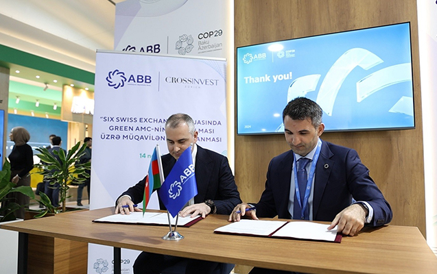 ABB və İsveçrənin Crossinvest Şirkətlər Qrupu arasında COP29 çərçivəsində müqavilə imzalanıb. Müqavilə İsveçrə birjasında (SIX Swiss Exchange) Yaşıl Aktiv İdarəolunan Sertifikatın (Green AMC) yerləşdirilməsi üzrə əməkdaşlığı nəzərdə tutur.