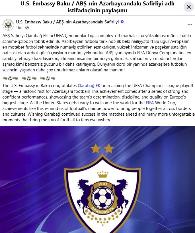 ABŞ-nin Bakıdakı Səfirliyi UEFA Çempionlar Liqasının pley-off mərhələsinə vəsiqə qazanan “Qarabağ”ı təbrik edib.