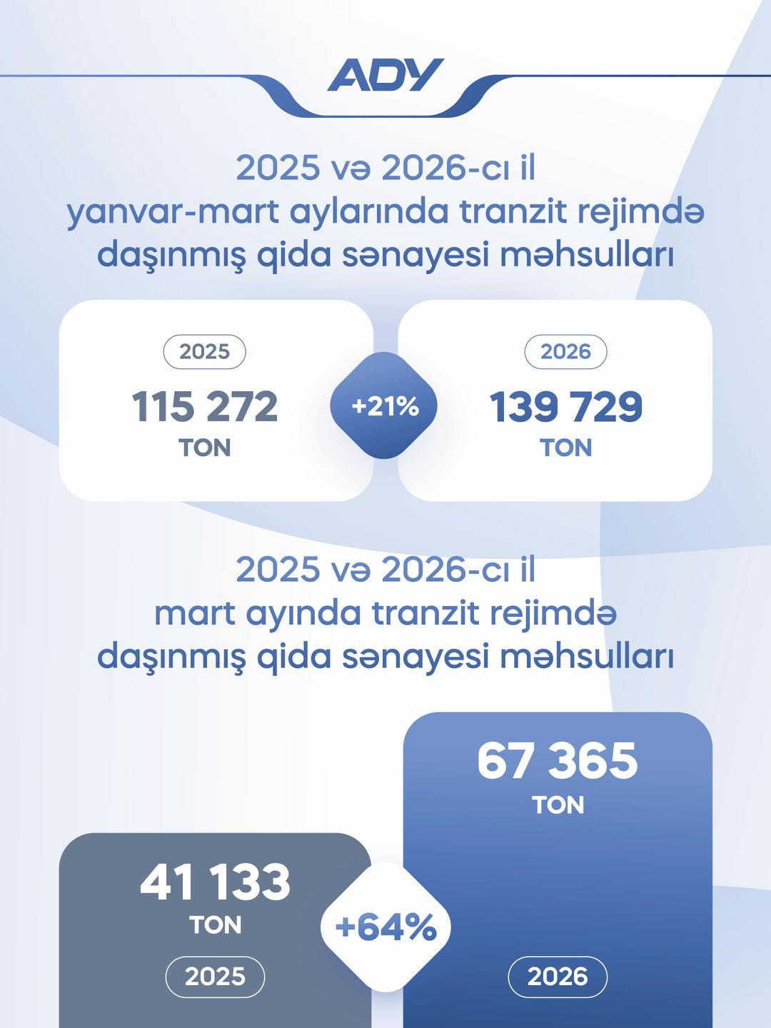 Qeyd edək ki, qida sənayesi məhsullarının tranzit daşımaları da bu ilin birinci rübündə 21% (139,7 min ton), mart ayında isə 64% (67,3 min ton) artıb.