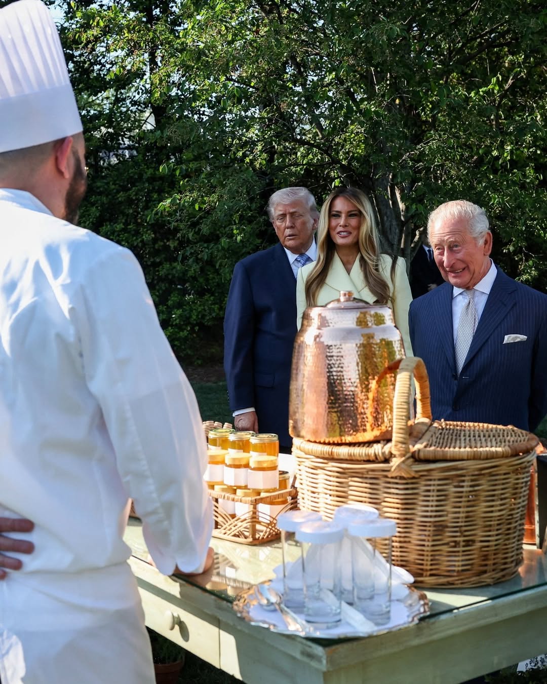 Daha sonra Tramp cütlüyü Kral ailəsinə Ağ Evin həyətində yaradılmış Ağ Ev formasındakı arı yeşiyini göstəriblər.