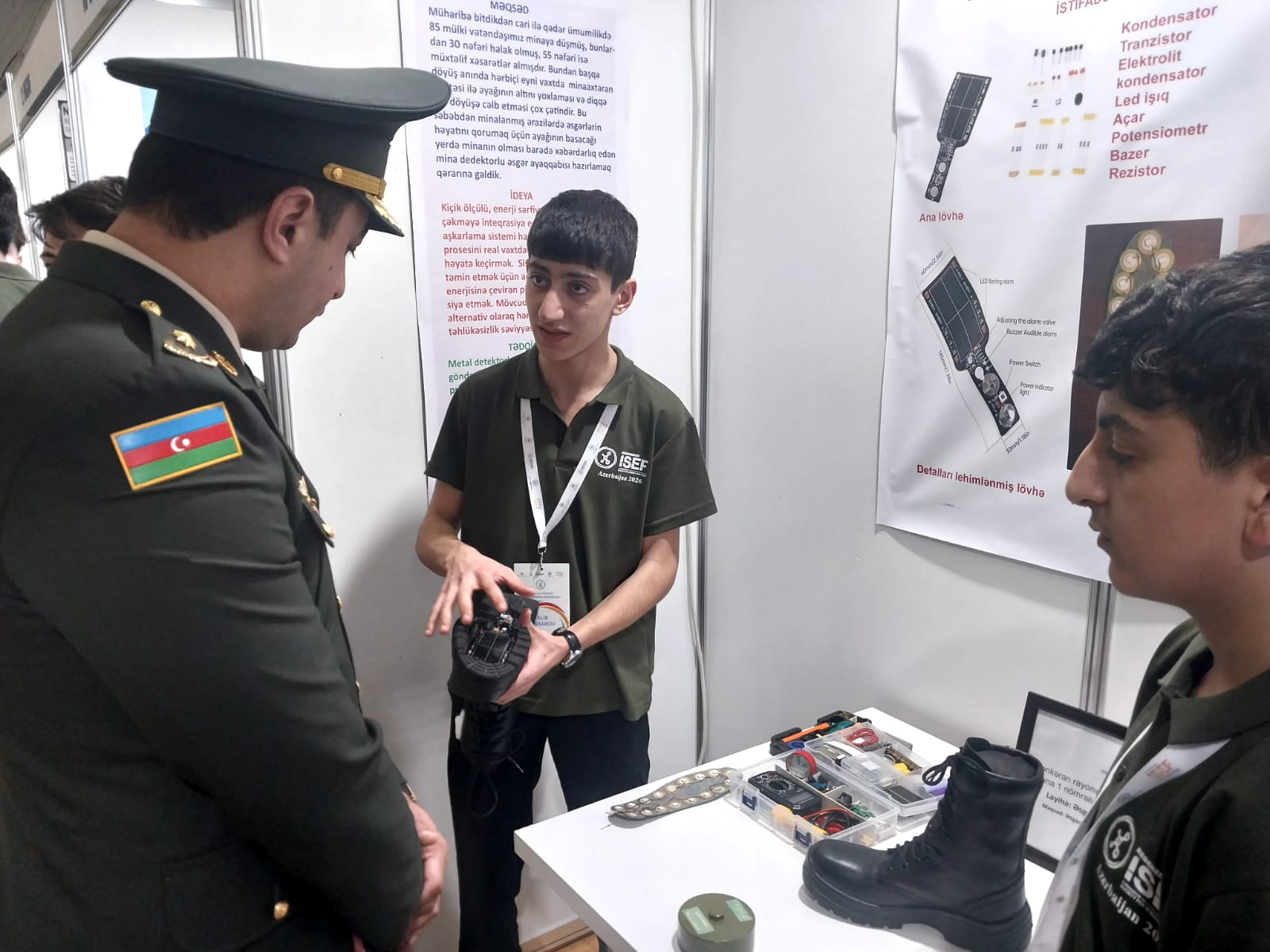 Digər iştirakçı Talib Cabbarov isə layihənin texniki xüsusiyyətləri barədə məlumat verib. Onun sözlərinə görə, hazırlanan sistem əsgərlərin fərdi təhlükəsizliyini artırmaq məqsədilə ayaqqabının alt hissəsinə yerləşdirilən xüsusi mina detektoru prototipi üzərində qurulub: