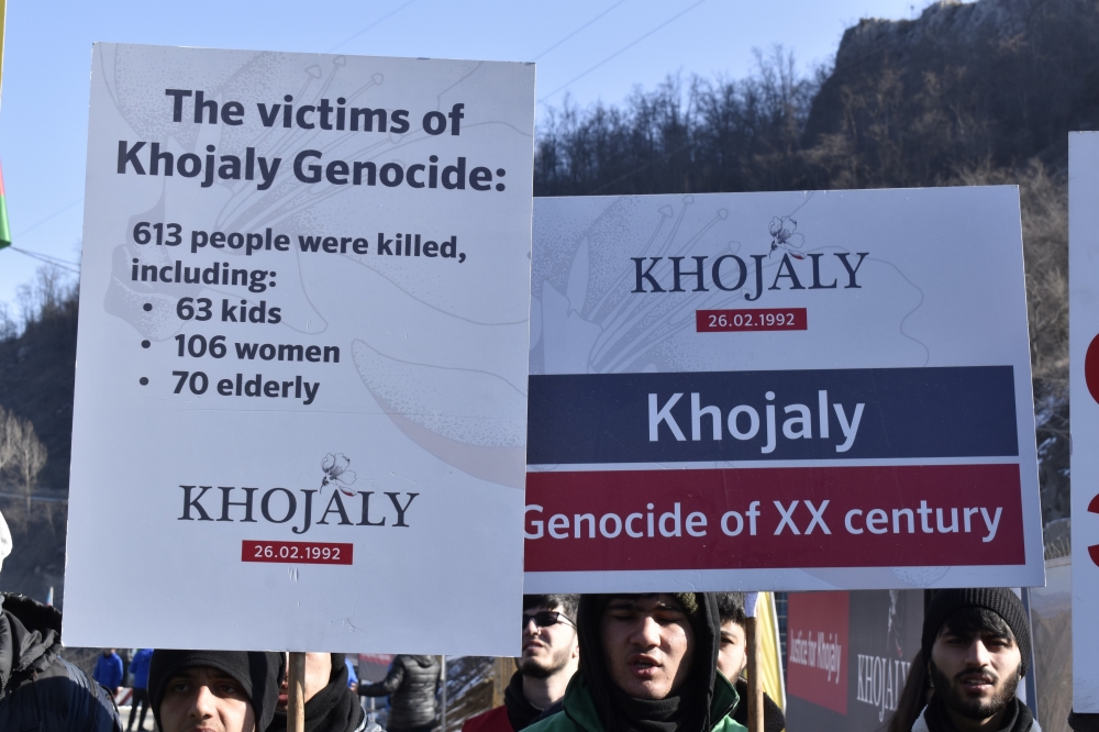 “Qafqazinfo” AZƏRTAC-a istinadən xəbər verir ki, aksiya iştirakçıları Azərbaycan, rus, ingilis dillərində Xocalı faciəsi ilə bağlı hazırlanmış plakatları qaldırır, “Xocalıya Ədalət!”, “Justice for Khojaly” şüarlarını səsləndirirlər.