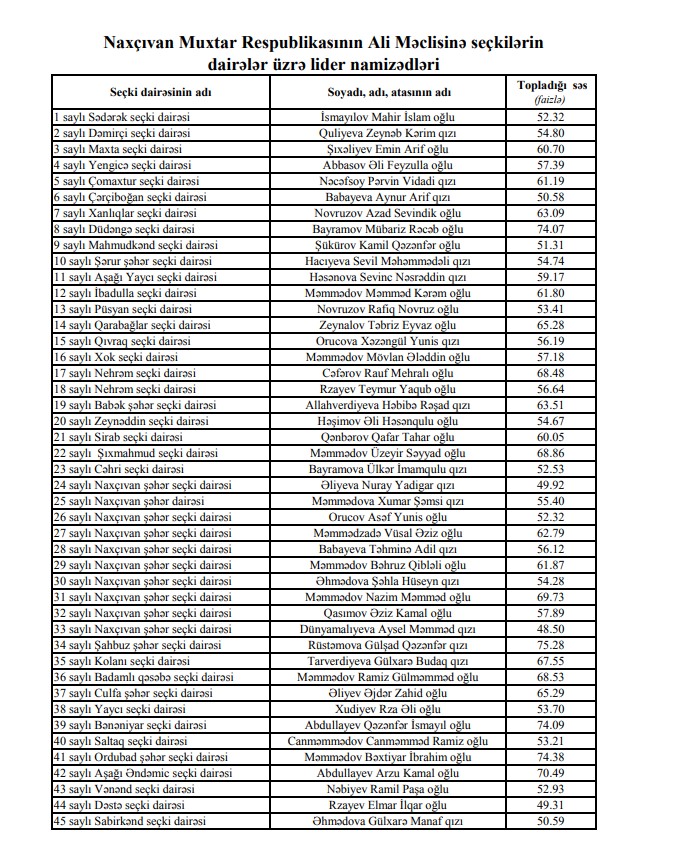 Naxçıvan Muxtar Respublikası Mərkəzi Seçki Komissiyası Naxçıvan Muxtar Respublikası Ali Məclisinə seçkilərin dairələr üzrə lider namizədlərini açıqlayıb.
