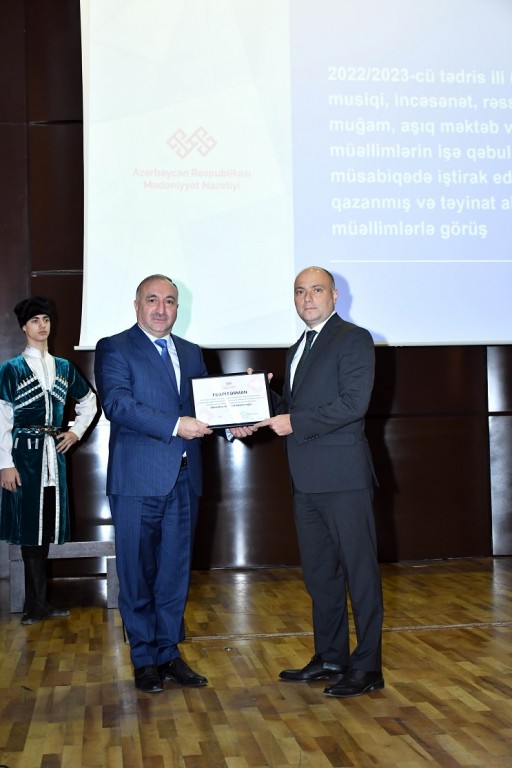 Sonda müsabiqədə yüksək bal toplayan müəllimlərə və müsahibə komissiyalarının üzvlərinə nazirliyin fəxri fərmanlarını təqdim edən Anar Kərimov Azərbaycan mədəniyyətinin, təhsilinin inkişafındakı fəaliyyətlərində onlara uğurlar arzulayıb.