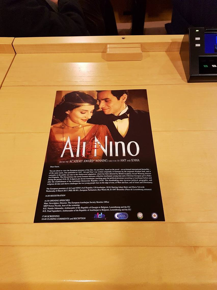 Martın 8 -də Brüsseldə yerləşən Avropa Parlamentində “Əli və Nino” filminin Avropa premyerası keçirilib. Filmin nümayişi Avropa Azərbaycan Cəmiyyətinin (TEAS) Benelüks ofisinin Azərbaycanın Belçika, Lüksemburq və Avropa İttifaqındakı səfirliyi, Gürcüstanın Belçika, Lüksemburq və Avropa İttifaqındakı səfirliyi və ALDE Qrup təşkilatı ilə birgə əməkdaşlıq şəraitində təşkil edilib.