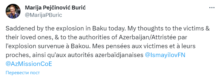 Avropa Şurasının Baş katibi Mariya Peyçinoviç Buriç Bakıda baş verən partlayışla bağlı başsağlığı verib.