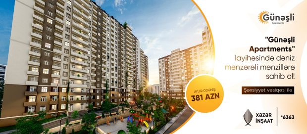 Xəzər İnşaat “Günəşli Apartments” layihəsində arayışsız və zaminsiz ŞƏXSİYYƏT VƏSİQƏSİ ilə AYLIQ 381 AZN-ə tam təmirli, dəniz mənzərəli mənzillər təklif edir! Şəhərimizin səfalı guşələrindən olan, havasının təmizliyi ilə seçilən Günəşli yaylasında tikilmiş “Günəşli Apartments” yaşayış kompleksində sizin və ailənizin komfortu üçün bütün imkanlar düşünülüb.