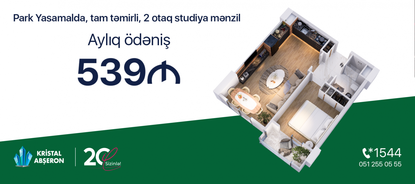 “Kristal Abşeron”dan kirayədən sərfəli təklif var! Aylıq 539 manat ödəməklə tam təmirli, 2 otaq studiya mənzilə sahib olmaq imkanı “Park Yasamal”da. Satışa çıxan yeni mərhələdə həmçinin 2, 3 və 4 otaqlı mənzillər də mövcuddur.