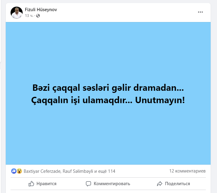 Belə ki, o, şəxsi hesabında “bəzi çaqqal səsləri gəlir “drama”dan... Çaqqalın işi ulamaqdır... Unutmayın!”, - deyə paylaşım edib.