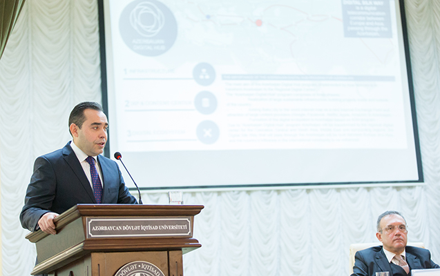 Azərbaycan Dövlət İqtisad Universitetində (UNEC) yerli və xarici ekspertlərin iştirakı ilə baş tutmuş tədbirdə çıxış edən AzerTelecom şirkətinin baş direktoru Fuad Allahverdiyev ölkəmizin rəqəmsal mərkəzə çevrilməsi istiqamətində icra edilən “Azerbaijan Digital Hub” proqramını tədqim edib, müasir dövrdə rəqəmsal transformasiya prosesləri barədə geniş danışıb. Fuad Allahverdiyev rəqəmsallaşmanın cəmiyyətlər və dövlətlər qarşısında inkişaf üçün yeni imkanlar açdığını, rəqəmsal iqtisadiyyat quruculuğu məsələsinin hazırda ölkəmiz üçün də mühüm əhəmiyət kəsb etdiyini vurğulayıb. Fuad Allahverdiyev proqram çərçivəsində infrastruktur quruculuğu layihələri barədə danışıb, ölkə daxilində fiber-optik kabel xətlərinin çəkilməsi üçün Azərbaycan Dəmir Yolları QSC ilə birgə icra edilən layihəni, eləcə də Azərbaycanla Orta Asiya ölkələri arasıda Xəzərin dibi ilə Transxəzər Fiber Optik kabel xəttinin çəkilməsi layihəsini qeyd edib. O bu layihələr sayəsində Avropa ilə Asiya arasında Azərbaycan vasitəsilə rəqəmsal ipək yolunun formalaşacağını bildirib, “Digital Hub” proqramının son nəticədə ölkənin rəqəmsal mərkəzə çevrilməsi və rəqəmsal iqtisadiyyatın formalaşmasına töhfə verəcəyini vurğulayıb.