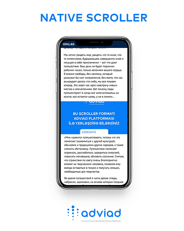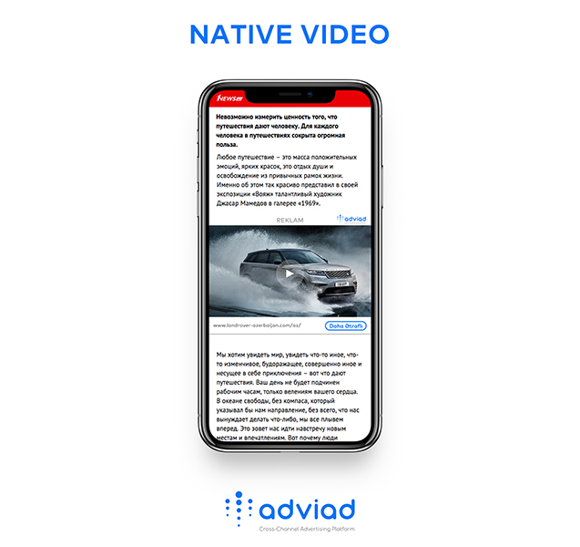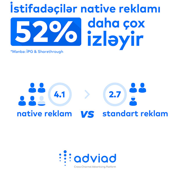 Haqqında danışdığımız bu ideal reklam formatı artıq ilk dəfə olaraq ölkəmizdə Adviad platforması ilə reklamçılara, yayımçılara və reklam agentliklərinə əlçatandır. Adviad “native” reklamları lokal bazara uyğunlaşdırmaqla yanaşı, həmçinin lokal bazara uyğun öz xüsusi 6 formatını da yaradıb. Hər biri unikal olan və yüksək effektivlik gətirən bu 6 format texniki cəhətdən Azərbaycanda ilkdir və platformada istifadəçilərə təqdim edilir. Bundan əlavə, ilk dəfə olaraq lokal saytlarda hava dərəcəsinə görə reklam yerləşdirmək mümkündür.