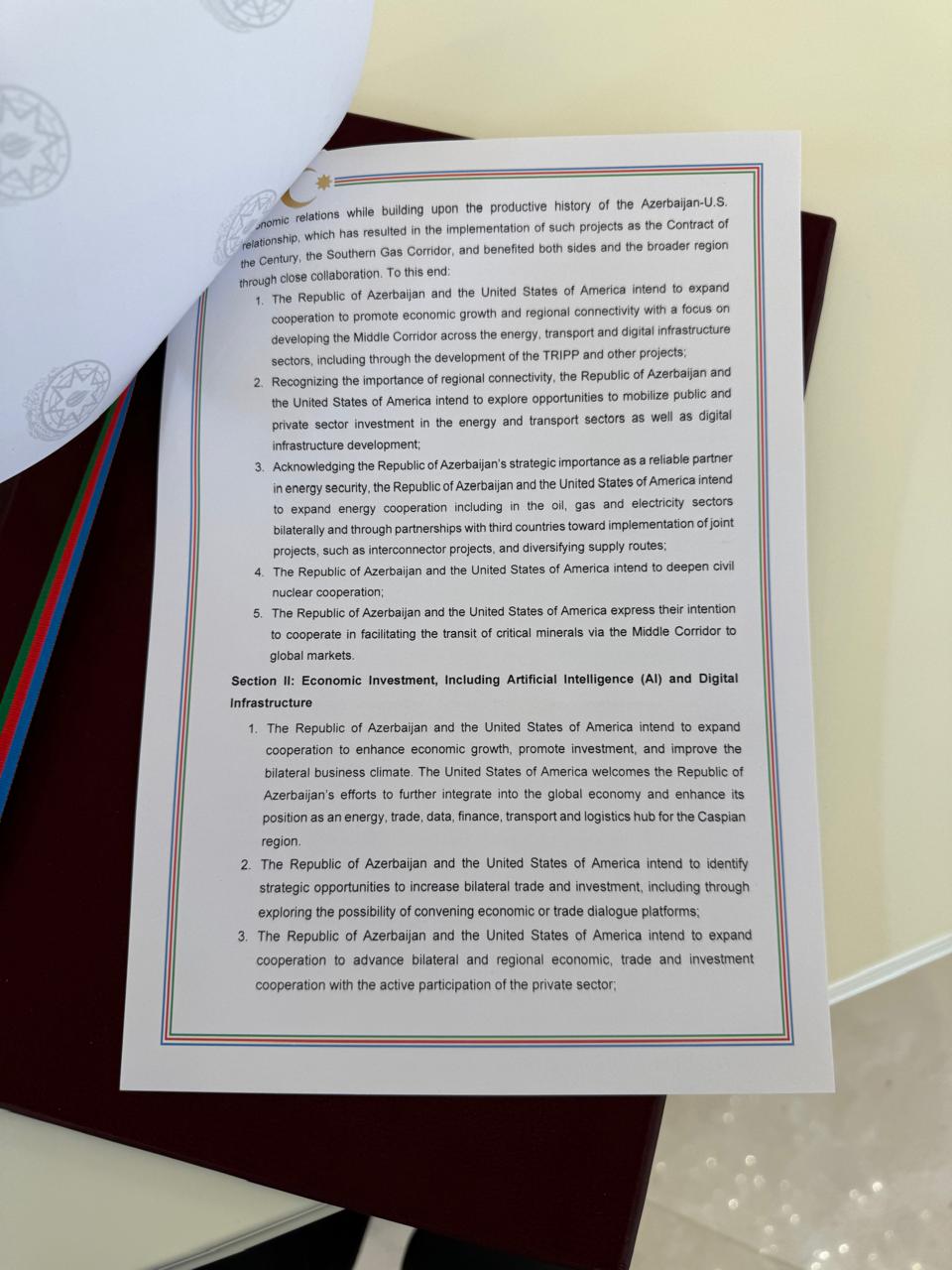1.Azərbaycan Respublikası və Amerika Birləşmiş Ştatları, Orta Dəhlizin inkişafına xüsusi diqqət ayıraraq enerji, nəqliyyat və rəqəmsal infrastruktur sektorlarında, o cümlədən TRIPP və digər layihələrin inkişaf etdirilməsi vasitəsilə iqtisadi artımı və regional bağlantıları təşviq etmək üçün əməkdaşlığı genişləndirmək niyyətindədirlər;