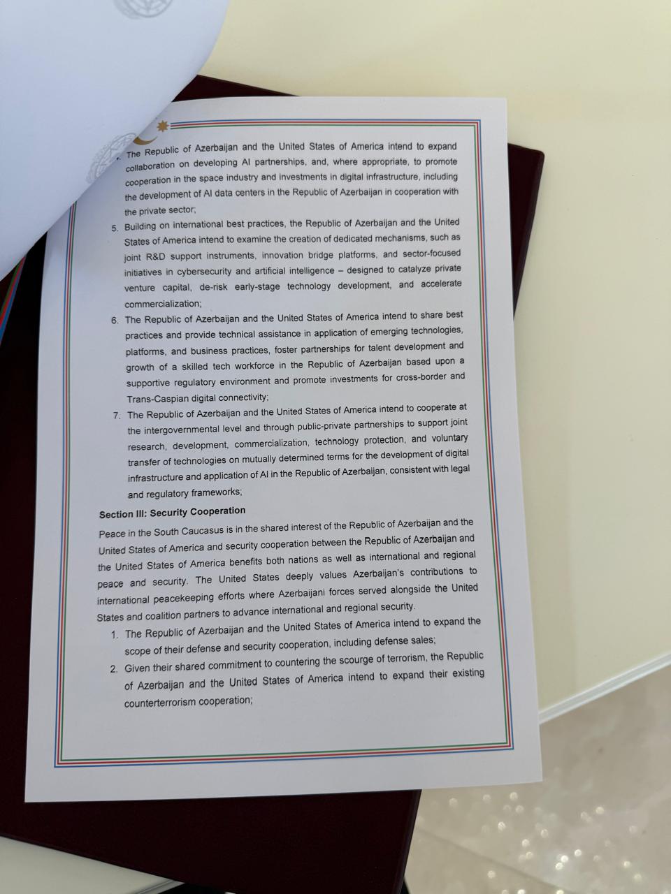 4. Azərbaycan Respublikası və Amerika Birləşmiş Ştatları AI tərəfdaşlıqlarının inkişaf etdirilməsi üzrə əməkdaşlığı genişləndirmək və müvafiq hallarda, kosmik sənaye sahəsində əməkdaşlığı və Azərbaycan Respublikasında özəl sektorla əməkdaşlıq ilə AI data mərkəzlərinin inkişafı da daxil olmaqla, rəqəmsal infrastruktura sərmayə qoyuluşunu təşviq etmək niyyətindədirlər;
