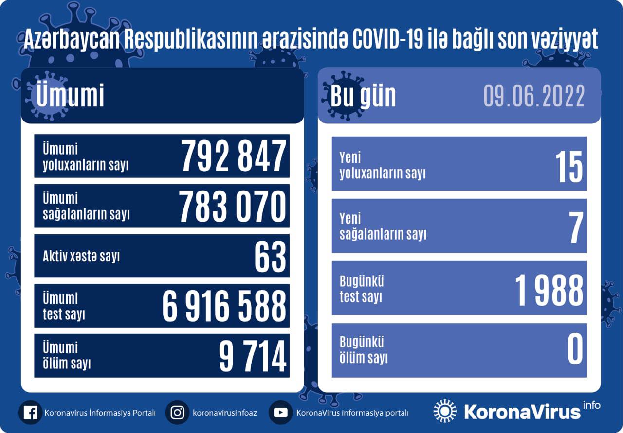 Azərbaycanda son sutkada koronavirus infeksiyasına 15 yeni yoluxma faktı qeydə alınıb, 7 nəfər müalicə olunaraq sağalıb və evə buraxılıb.