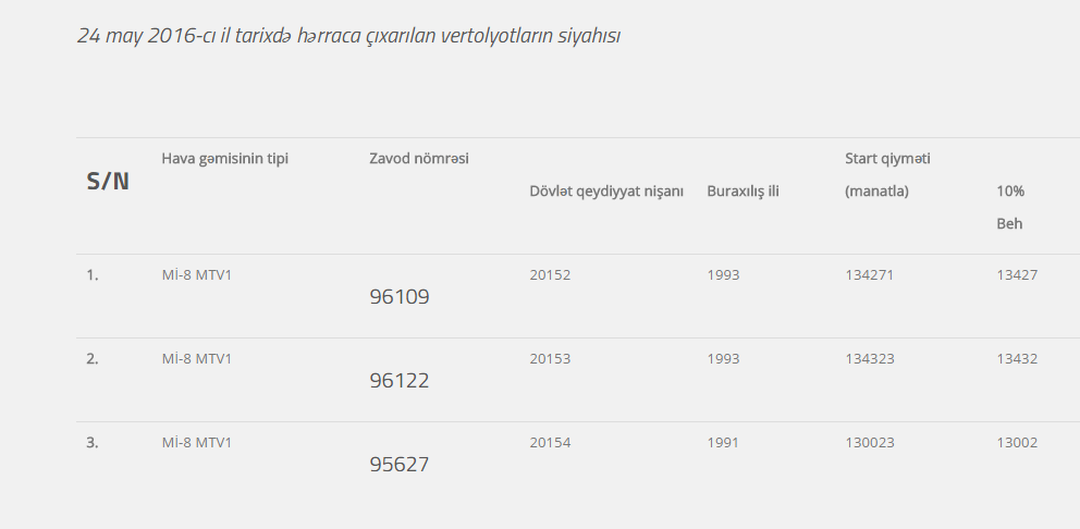 Komitə yanında Hərracların Təşkili üzrə Auksion Mərkəzindən “Qafqazinfo”ya verilən məlumata görə, mayın 24-də keçiriləcək hərracda 3 vertolyot satışa çıxarılacaq.