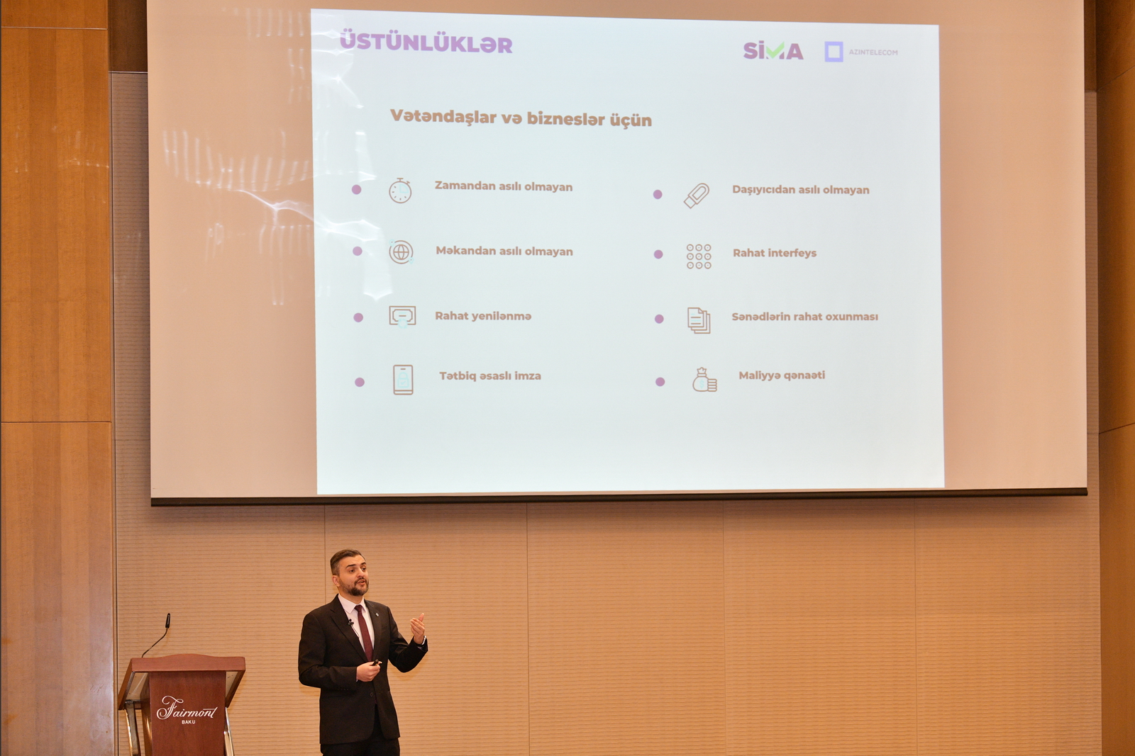 “AzInTelecom” MMC-nin İdarə Heyətinin sədri vəzifəsini müvəqqəti icra edən Elxan Əzizov yaxın zamanda vətəndaşların istifadəsinə veriləcək SİMA-nın hər kəs üçün əlçatan olacağını deyib. Tərəfdaş şirkətlər – “SVORT”un Biznesin inkişafı üzrə müşaviri Kamal Əliyev və “Sinam”ın prezidenti Elçin Əliyev çıxışlarında dövlət-özəl tərəfdaşlığının səmərəliliyindən danışıblar.