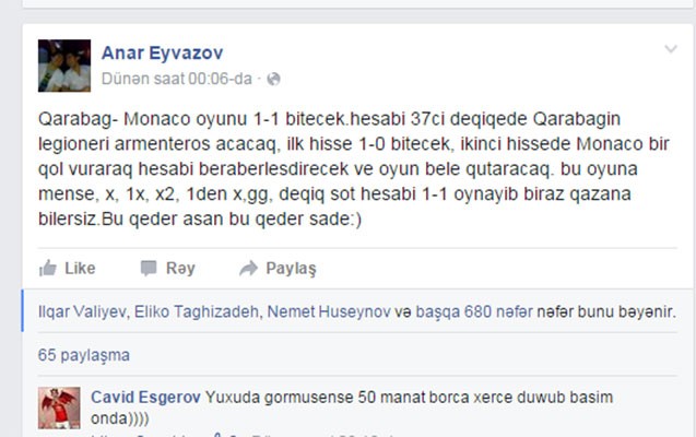 Dünən Avropa Liqasının qrup mərhələsində Tofiq Bəhramov adına Respublika stadionunda baş tutan “Qarabağ”- “Monako” matçından əvvəl hesabla bağlı verilən dəqiq proqnoz dünəndən sosial şəbəkələrdə geniş müzakirələrə səbəb.