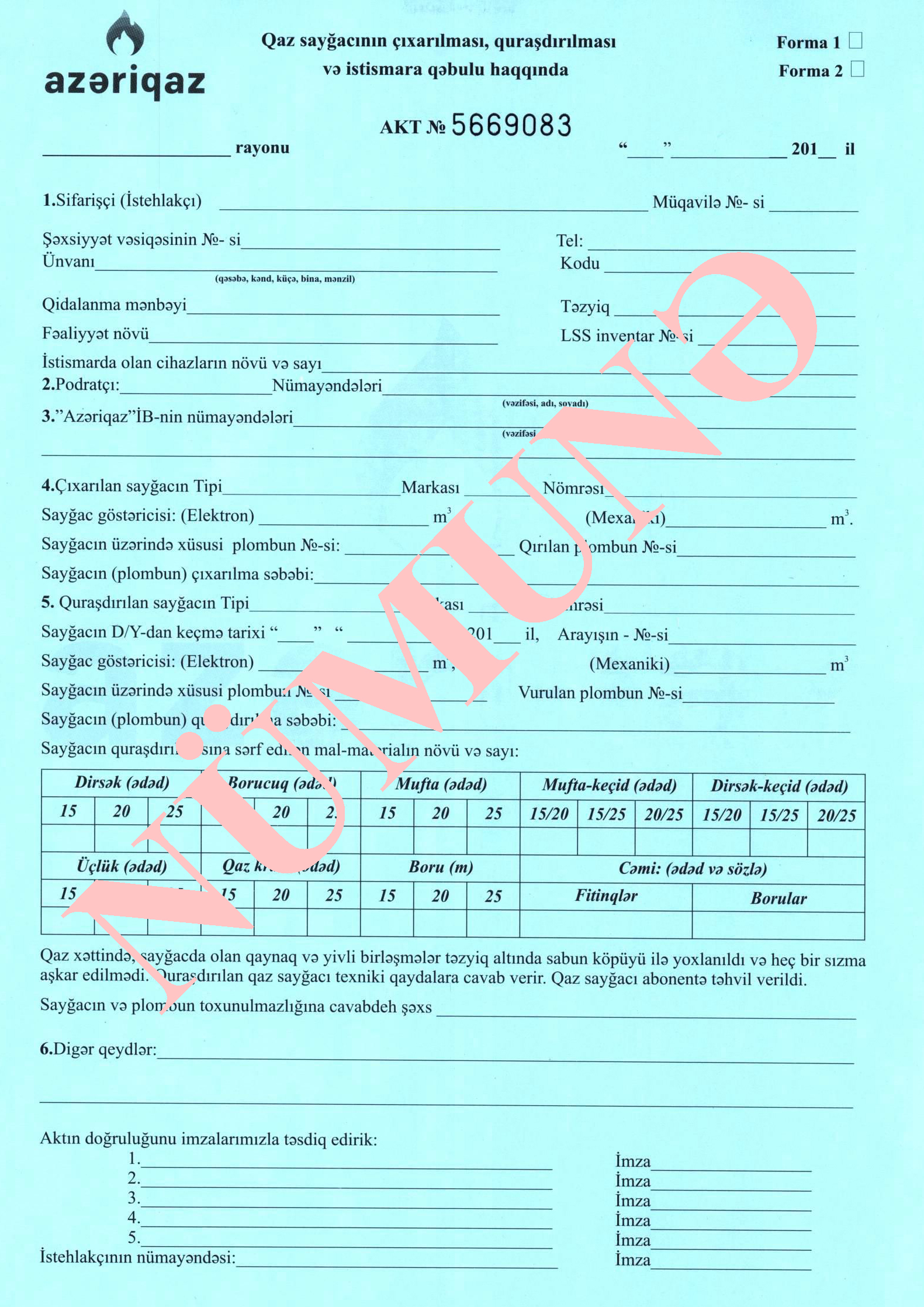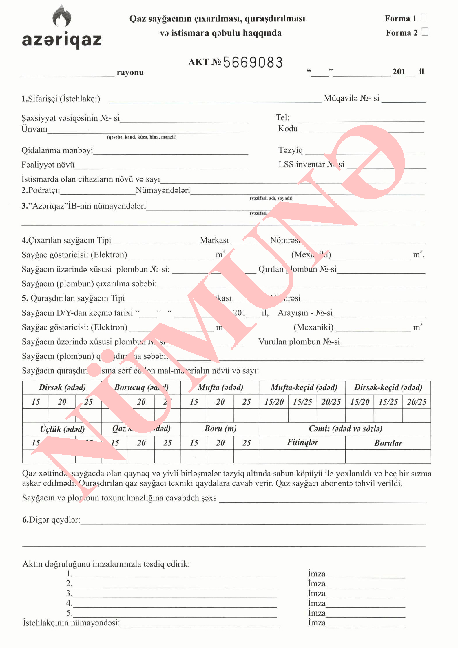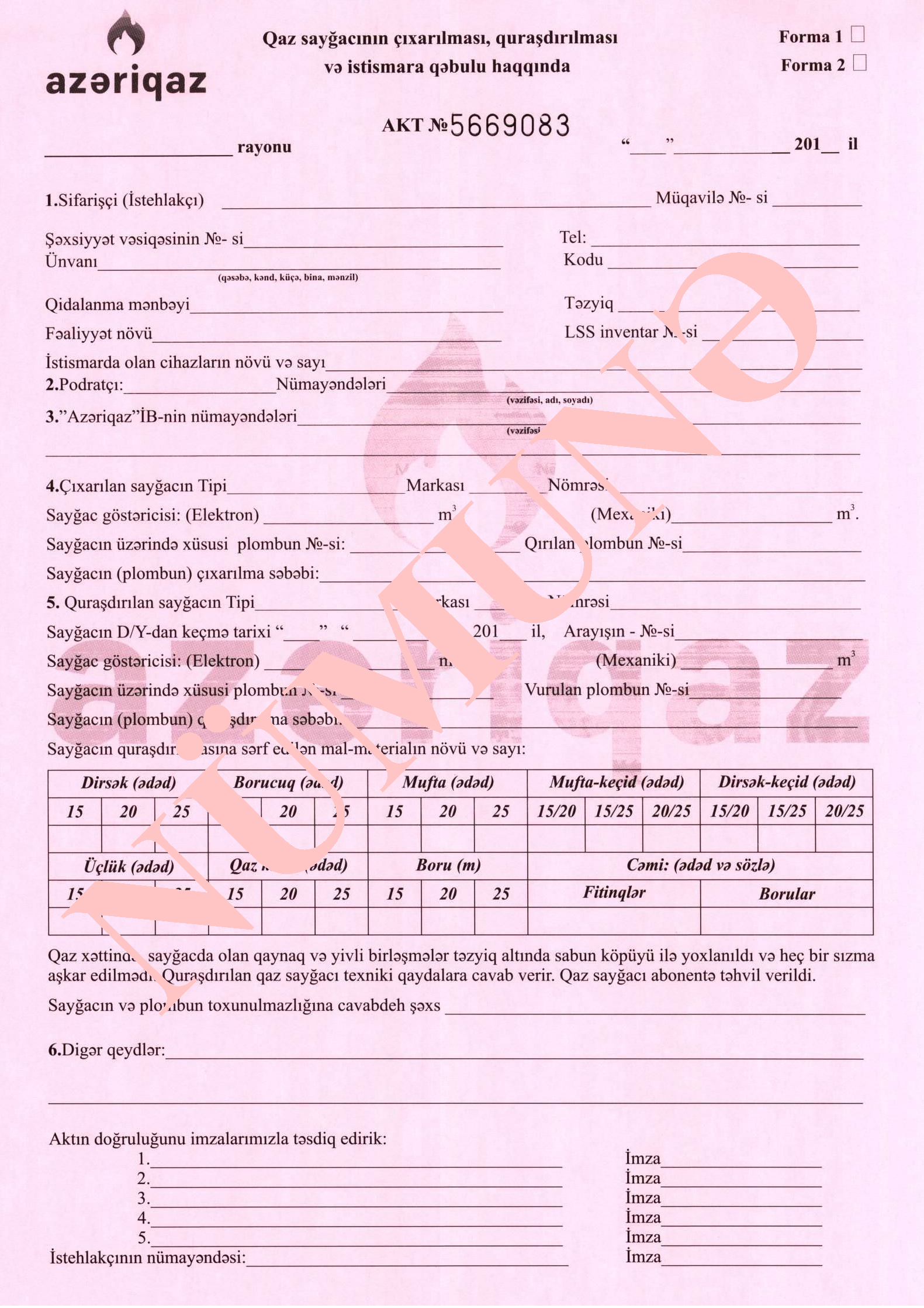 Eləcə də, inandırıcı olması üçün qeyri-qanuni akt tərtib edərək abonentlərə təqdim edirlər. Bununla bağlı istehlakçıların nəzərinə çatdırılır ki, Birliyin işçiləri mənzillərdə yerləşən qaz sayğaclarına profilaktik baxış və xidmət göstərəcəyi zaman “Azəriqaz” İstehsalat Birliyinin əməkdaşı olduğunu təsdiq edən xidməti vəsiqə tələb edilməlidir. Həmçinin öz xidməti vəsiqələrini təqdim etdikdən sonra yerlərdə göstərdikləri bütün xidmətlər ödənişsizdir və tərtib etdikləri xüsusi nömrəli aktlar isə sarı, qırmızı və göy rəngdə olmaqla üç nüsxədən ibarət tərtib olunaraq, qırmızı rəngli akt abonentə təqdim edilir. Sonda bir daha bildirilir ki, sadalanan qeyri-qanuni hallarla rastlaşan vətəndaşlar yaşadıqları ərazi üzrə müvafiq polis bölməsinə müraciət etməlidirlər.