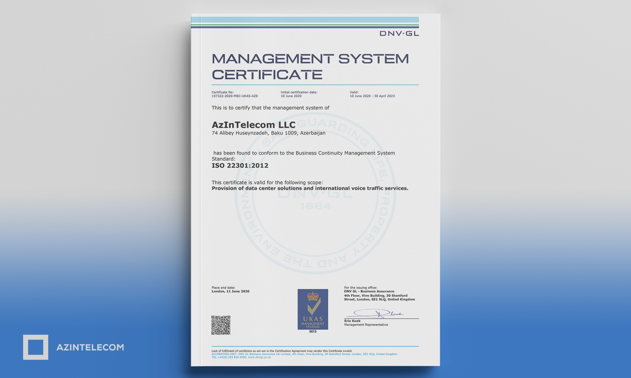 Nəqliyyat, Rabitə və Yüksək Texnologiyalar Nazirliyi nəzdində fəaliyyət göstərən “AzInTelecom” MMC Biznesin Davamlılığı İdarəetmə Sistemi standartı üzrə sertifikata (ISO 22301:2012) layiq görülən ilk Azərbaycan şirkəti olub.