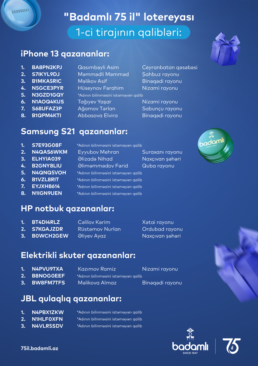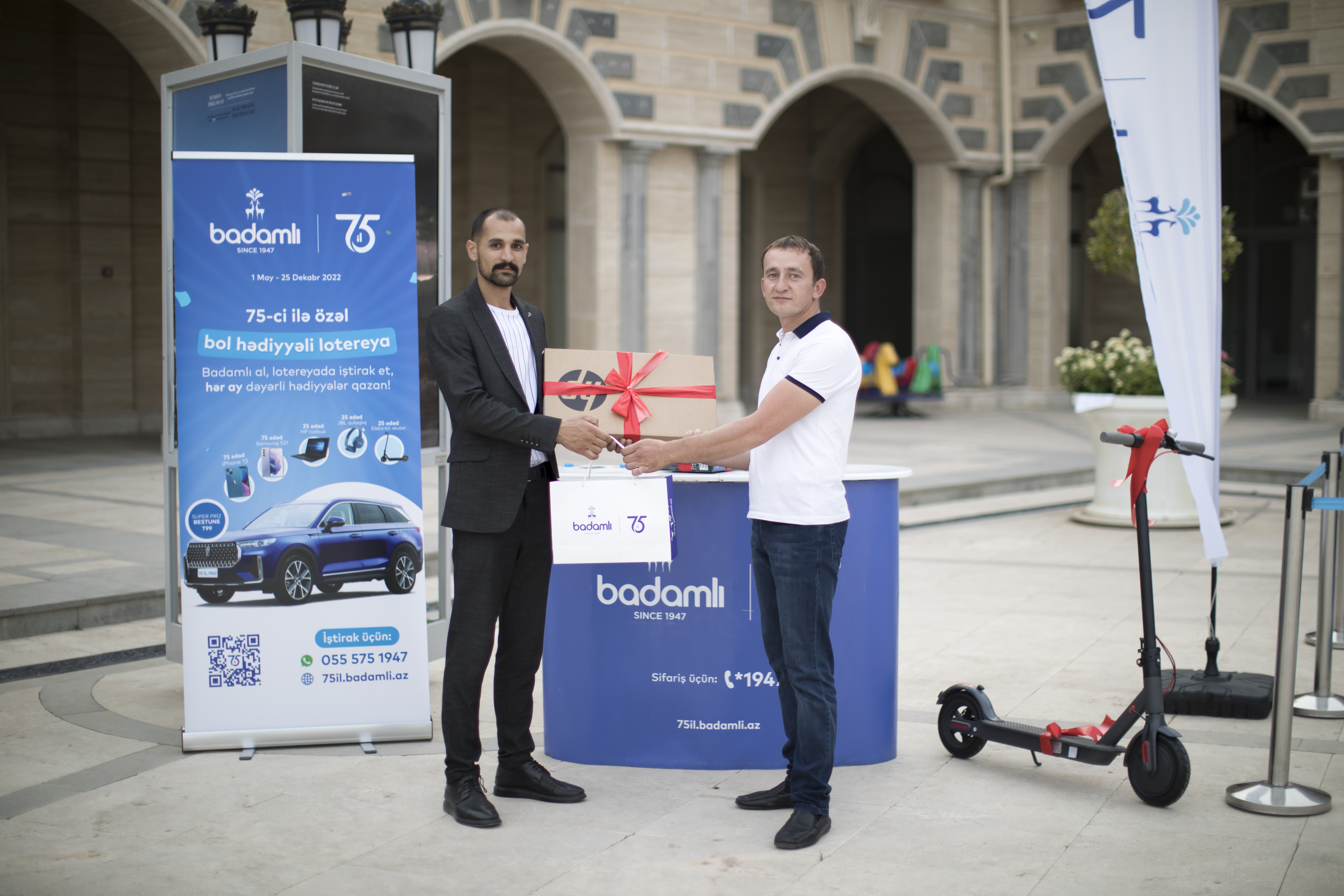 “Badamlı mineral sular” MMC-nin 75 illik yubileyi münasibətilə təşkil etdiyi “Badamlı 75” tirajlı stimullaşdırıcı lotoreyanın ilk mərhələsinin ilk tirajının qalibləri 29.05.2022 –ci il tarixində müəyyən olundu. “Badamlı”nın rəsmi feysbuk və instagram səhifələrində canlı efirində baş tutan lotereyada uğurlu qeydiyyatdan keçmiş kodlar arasından 25 kod yəni 25 iştirakçı bir-birindən dəyərli hədiyyələr qazanıb.