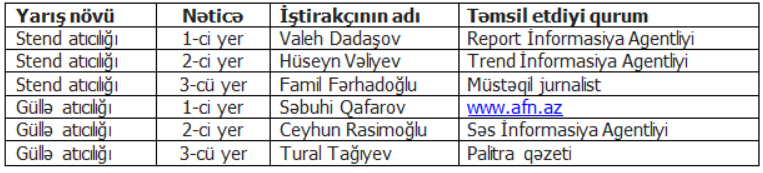Yarışın nəticələri aşağıdakı kimidir: