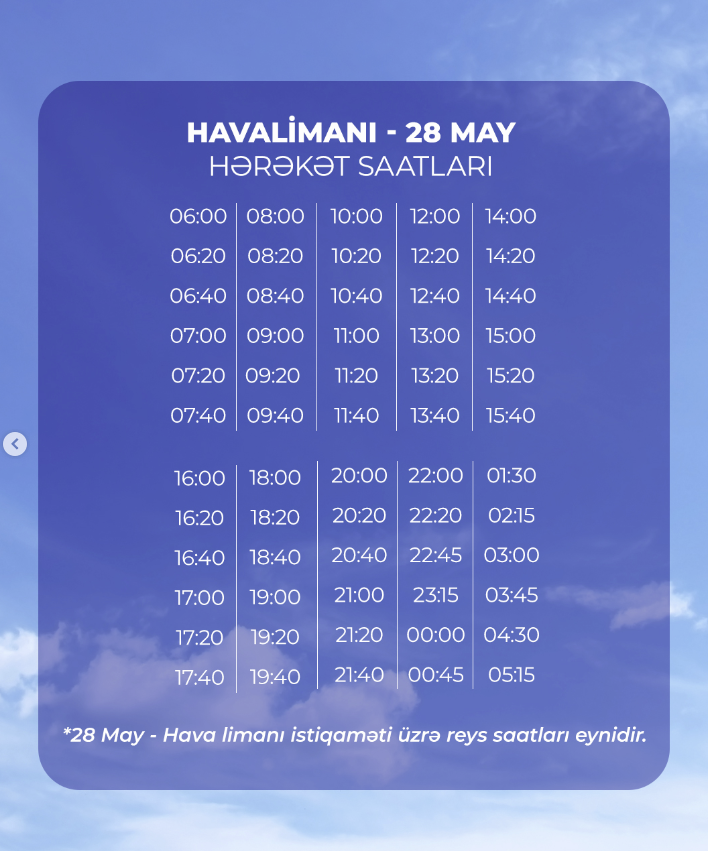 Bu gündən etibarən “H1 Airport Express” marşrutu 24 saat fəaliyyət göstərərək gündüz saatlarında 20 dəqiqəlik, gecələr isə 45 dəqiqəlik intervalla hərəkət edəcəklər.