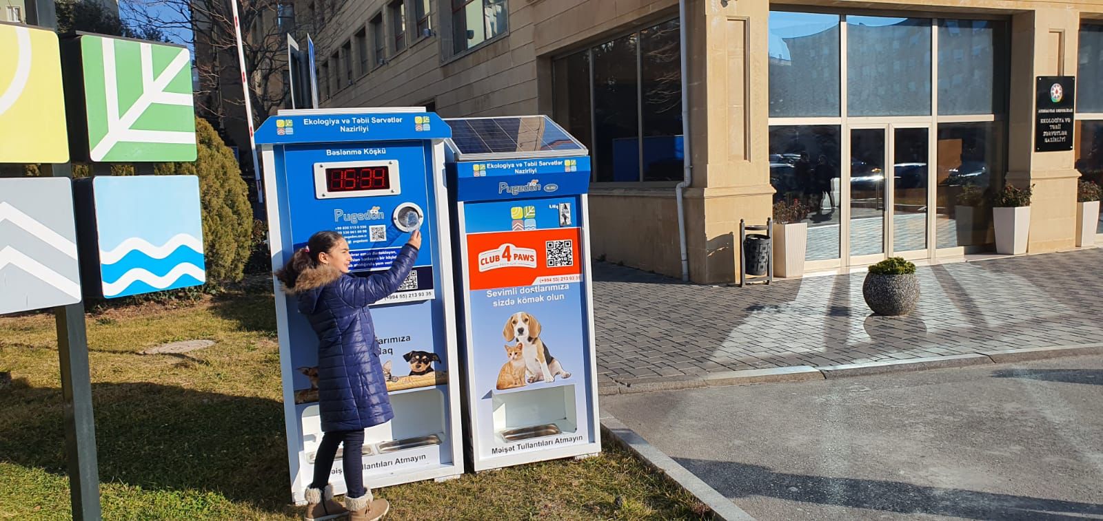 A.Səmədova onu da bildirib ki, enerjiyə qənaət məqsədilə köşklər günəş enerjisi ilə təmin olunub. Yerləşdirilən iki ədəd köşkdən biri qurğuya ödəniş etməklə, digəri isə istifadə olunmuş plastik qabdan istifadə mexanizmi əsasında işləyəcək və 40 qram yemin alınması mümkün olacaq.