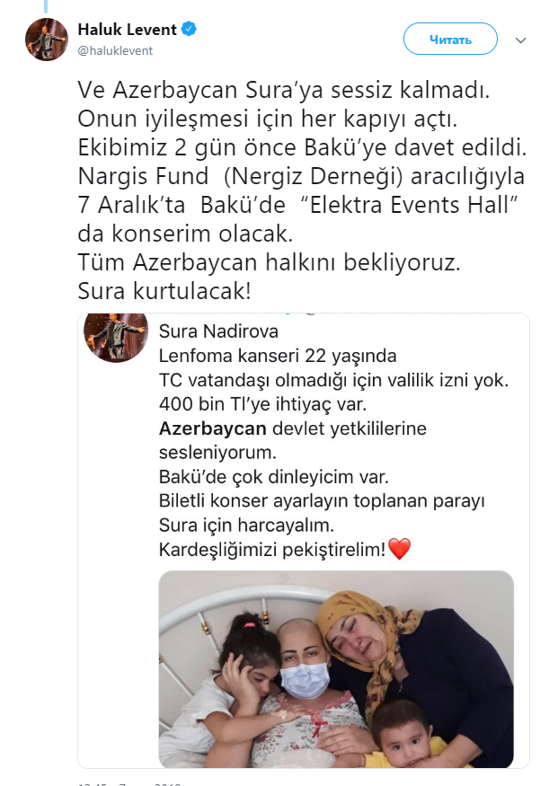 Qeyd edək ki, H. Levent bundan əvvəl 22 yaşlı Suranın sağalması üçün 400 min liraya ehtiyacı olduğunu bildirmişdi və buna görə Azərbaycanda konsert verməyə hazır olduğunu qeyd etmişdi.