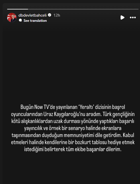 Türkiyənin Milliyyətçi Hərəkat Partiyasının (MHP) sədri Dövlət Baxçalı “Now” kanalında yayımlanan “Yeraltı” serialının baş obrazlarından birini canlandıran Uraz Kaygılaroğluna zəng edib.