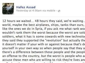 “Qafqazinfo” xəbər verir ki, Hafiz Əsəd özünün facebook səhifəsində ABŞ-ı tezliklə Suriyaya hücum etməyə çağırıb: