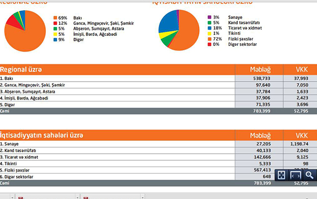 Ölkənin dövlət banklarının kredit portfeli 7440,8 milyon manat təşkil edib, özəl banklar tərəfindən isə 12 632 milyon manat kredit verilib. Qalan 2,7 faiz (559,5 milyon manat) bank olmayan kredit təşkilatlarının payına düşüb.