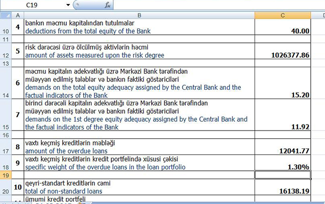“Access Bank”ın açıqladığı məlumatda isə vaxtı keçmiş kreditlərin məbləğinin 12041.77 AZN, bunun isə kredit portfelində xüsusi çəkisinin 1.30 % təşkil etdiyi qeyd olunub.