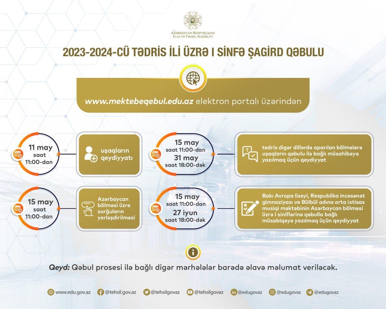 Belə ki, 11 may saat 11:00-dan etibarən elektron portalda uşaqların qeydiyyatı, 15 may saat 11:00-dan etibarən isə Azərbaycan bölməsi üzrə sorğuların yerləşdirilməsi (məktəb seçimi) həyata keçiriləcək.