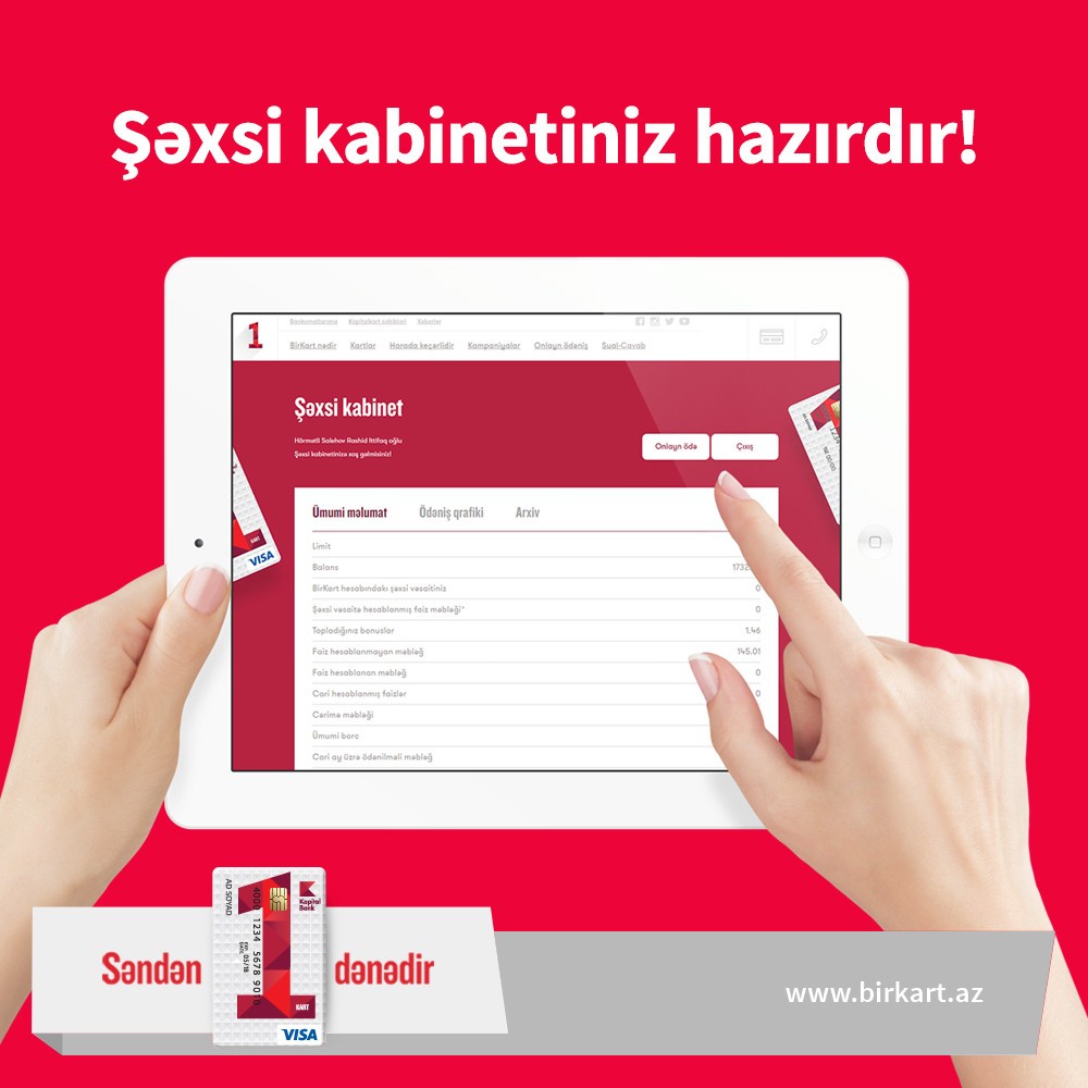 Kapital Bank-ın BirKart sahibləri üçün “Şəxsi kabinet” bölməsi istifadəyə verilib. “Şəxsi kabinet”ə daxil olmaq üçün müştərilər www.birkart.az saytının sağ-yuxarı küncündə olan müvafiq bölməni seçib, CİF kod və ya kartın son 8 rəqəmi, həmçinin doğum tarixini daxil etməlidirlər.