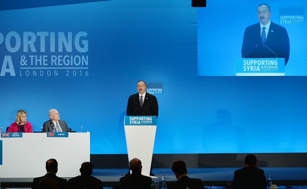 Bu gün biz bir çox çıxışları və yardım çağırışlarını dinlədik. Azərbaycan Suriyada humanitar inkişafa artıq töhfə vermiş və verəcək ölkələr arasındadır. Lakin ən əsası sülh, atəşkəs, siyasi həllin tapılmasıdır. Yalnız bundan sonra iş yerləri açılacaq, təhsil istənilən səviyyədə olacaq və insanlar öz gələcəyinə inanmağa başlayacaqlar. Biz bu böyük iqtisadi və sosial çətinliklərdən əziyyət çəkmiş bir ölkə kimi buna necə nail olmağın yolunu bilirik. Biz iş yerlərinin yaradılmasında təcrübəmizi paylaşa bilərik. Son on illikdə Azərbaycanda 1,5 milyon iş yeri yaradılmışdır. Biz təhsil sahəsindəki təcrübəmizi də paylaşa bilərik. Ölkəmizdə 3 mindən çox məktəb inşa edilmişdir və dediyim kimi, Azərbaycanda 100 faizlik savadlılıq səviyyəsinə nail olunmuşdur. Humanitar böhranın idarə olunması üzrə təcrübəmizi də paylaşa bilərik və biz bunu edəcəyik. Lakin ən önəmlisi sülhdür. Buna görə də Suriya böhranı üzrə siyasi həllin mümkün qədər tez tapılması bizim gündəliyimizdə duran bir nömrəli məsələdir. Əminəm ki, bu gün apardığımız müzakirələr həmin siyasi həllin tapılmasında öz vacib rolunu oynayacaqdır. Bu gün Azərbaycan əsaslı maliyyə və iqtisadi potensialı olan bir ölkə kimi buna sülh deyil, yalnız atəşkəs şəraitində nail ola bilmişdir.
