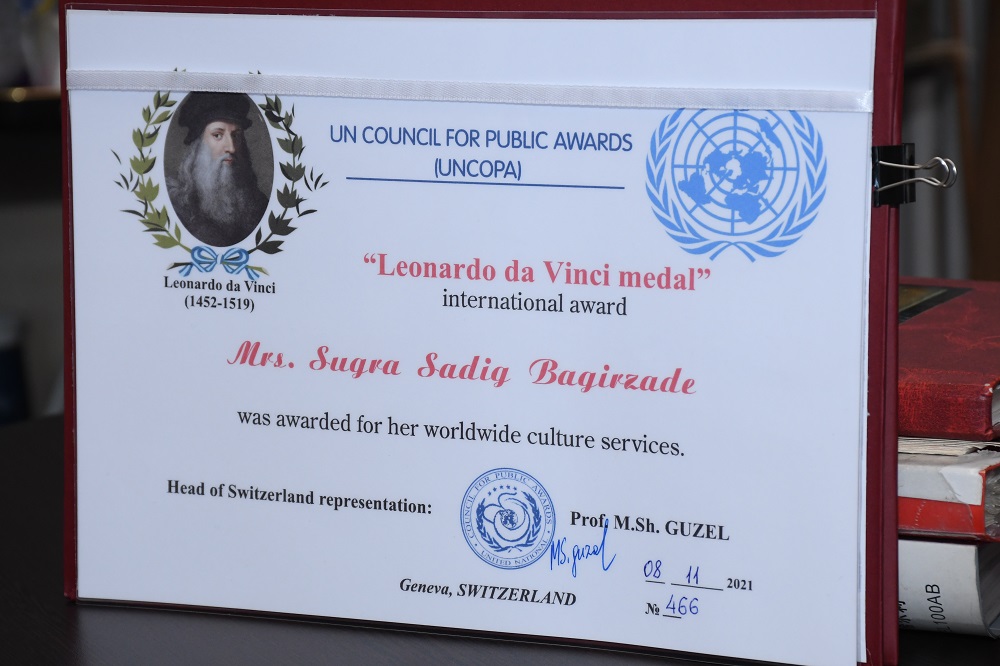 Aktrisa və rəssam, Əməkdar artist Suğra Bağırzadə BMT-nin İctimai Mükafatlar Şurası (UNCOPA) tərəfindən dünya mədəniyyətinə xidmətlərinə görə “Leonardo Da Vinci” medalı ilə təltif olunub.