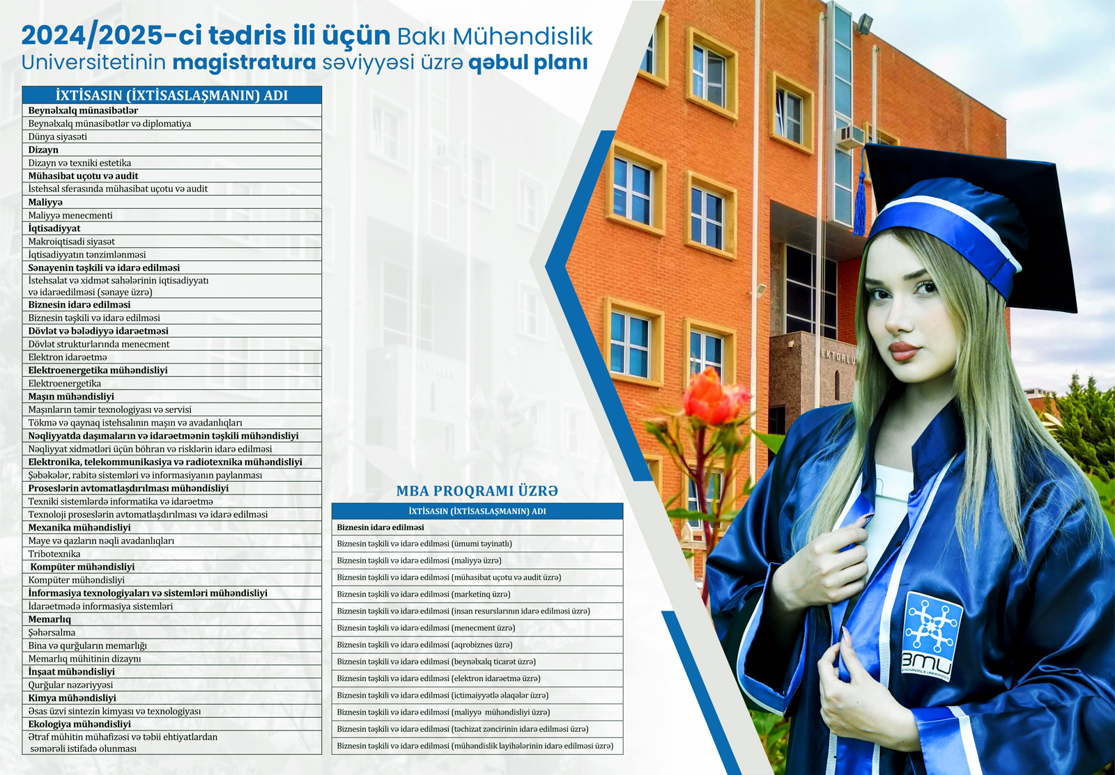 Bakı Mühəndislik Universitetinin (BMU) 2024/2025-ci tədris ili üçün bakalavr və magistratura səviyyələri üzrə tələbə qəbulu planı, həmçinin MBA (Biznesin idarə edilməsi) proqramına plan yerləri təsdiqlənib.