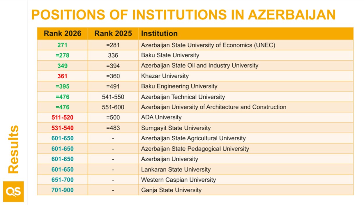 BMU Qərbi Asiya universitetləri arasında (QS Western Asia 2026) isə ötən illə müqayisədə 11 pillə irəliləyərək 23-cü yerdə qərarlaşıb.