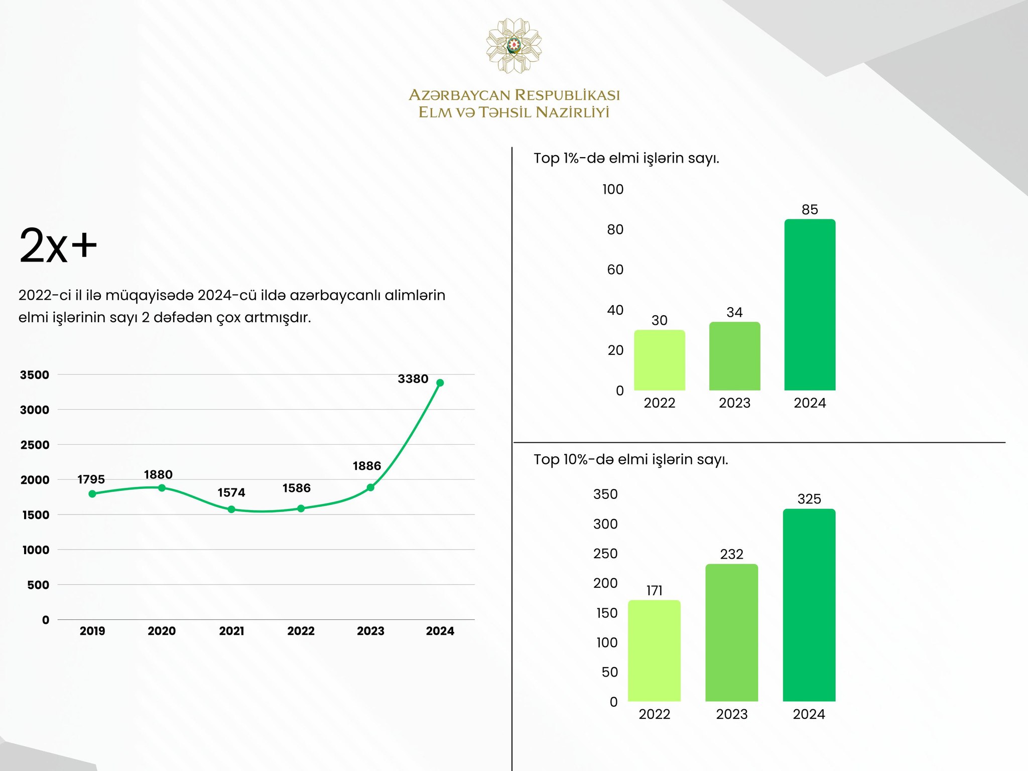 O qeyd edib ki, 2024-cü ildə alimlərimiz tərəfindən bu bazada indekslənən elmi nəşrlərdə dərc edilmiş məqalələrin sayı 2022-ci illə müqayisədə 2 dəfə çox olub. Məqalələrin 325-i dünyada ən çox oxunan 10%, 85-i isə 1% elmi işlərin arasında yer alıb.
