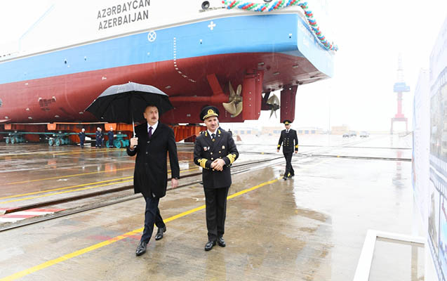 Prezident İlham Əliyev dekabrın 13-də “Azərbaycan Xəzər Dəniz Gəmiçiliyi” Qapalı Səhmdar Cəmiyyətinin sifarişi ilə Bakı gəmiqayırma zavodunda inşa olunan ilk neft tankerinin istismara verilməsi və “Azərbaycan” adlı gəmi-bərənin suya salınması mərasimində iştirak edib.