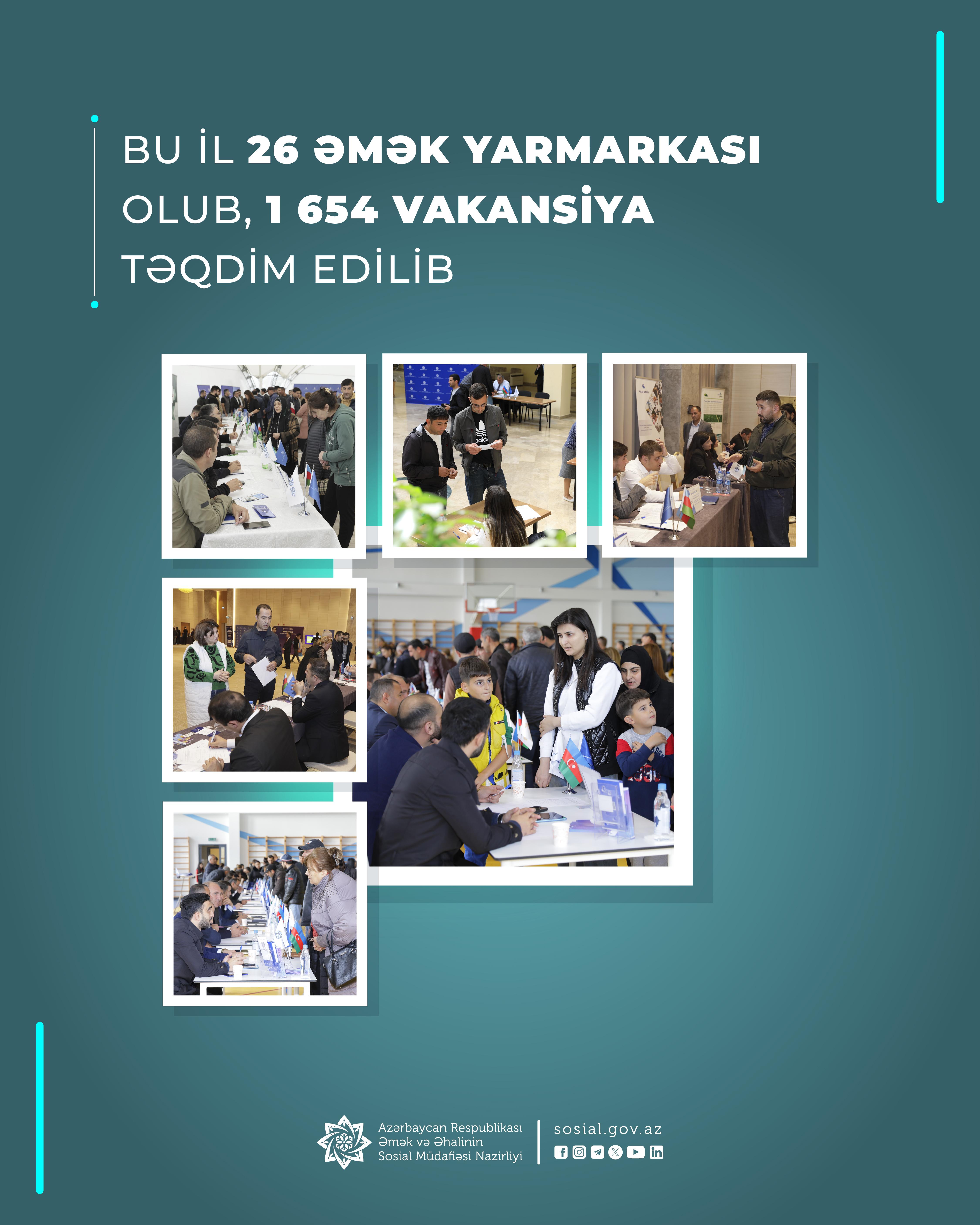 Əmək və Əhalinin Sosial Müdafiəsi Nazirliyinin (ƏƏSMN) tabeliyindəki Dövlət Məşğulluq Agentliyi tərəfindən bu ilin ötən dövründə paytaxt və regionlarda 26 əmək yarmarkası təşkil olunub.